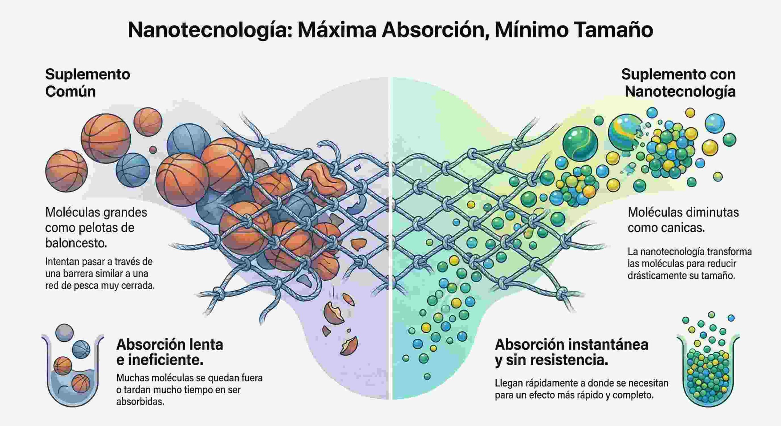La nanotecnología es una técnica avanzada que reduce los nutrientes —como vitaminas, proteínas o curcumina— a un tamaño nanométrico: